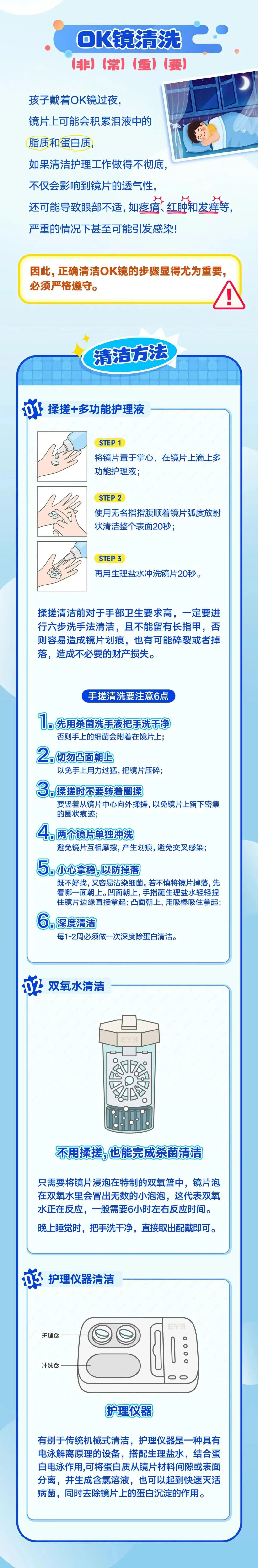 很多家长觉得“镜片看起来还能用”“孩子没说不舒服”,就不按时更换,这种侥幸心理可能给孩子眼睛带来伤害,具体风险包括: 1.角膜感染风险升高 长期使用的镜片表面,会附着泪液中的蛋白质、脂质并形成生物膜。这类生物膜难以彻底清洁,容易滋生细菌、真菌,一旦清洁不到位或出现角膜损伤,病原体可能侵入角膜,引发角膜炎、角膜溃疡等疾病。 2.易造成角膜上皮损伤 超期使用的镜片可能出现边缘磨损、变形或表面粗糙,戴镜时会反复摩擦角膜上皮,导致角膜损伤。孩子可能出现眼睛刺痛、异物感、流泪等症状,受损的角膜还会增加感染概率。 3.近视控制效果打折扣 OK镜通过夜间塑形角膜延缓眼轴增长,超期镜片可能因镜片的轻微变形会让其塑形力下降,会呈现离焦环不理想。这不仅会导致白天裸眼视力下降,还会让近视控制达不到预期效果。如何科学护理OK镜?